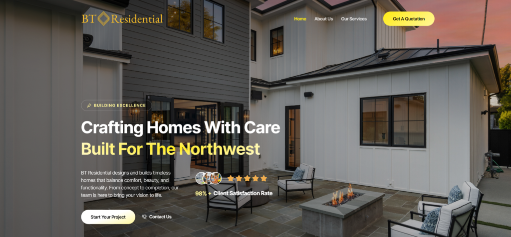 BT Residential is a residential construction company focused on creating custom homes, renovations, and home expansions with a strong emphasis on quality, craftsmanship, and client satisfaction. The website was designed to clearly communicate the company’s expertise in transforming clients’ visions into beautifully crafted living spaces.